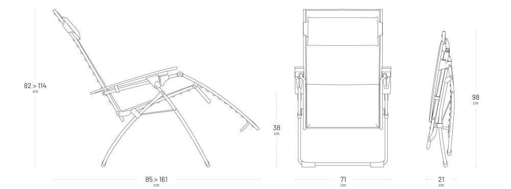 Multipositions-Relaxsessel mit Clips. Ohne Querstrebe an der oberen Rückenlehne und am unteren Teil der Fußstütze