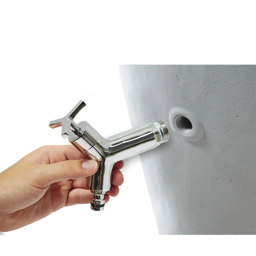 Die integrierte Pflanzschale mit einer Tiefe von 20 cm bietet kreative Gestaltungsmöglichkeiten und dient gleichzeitig als Kindersicherung. Die Wasserentnahme erfolgt bequem über einen ¾»-Anschluss an der Vorderseite, während ein zusätzlicher Anschluss am Boden die Restentleerung ermöglicht.