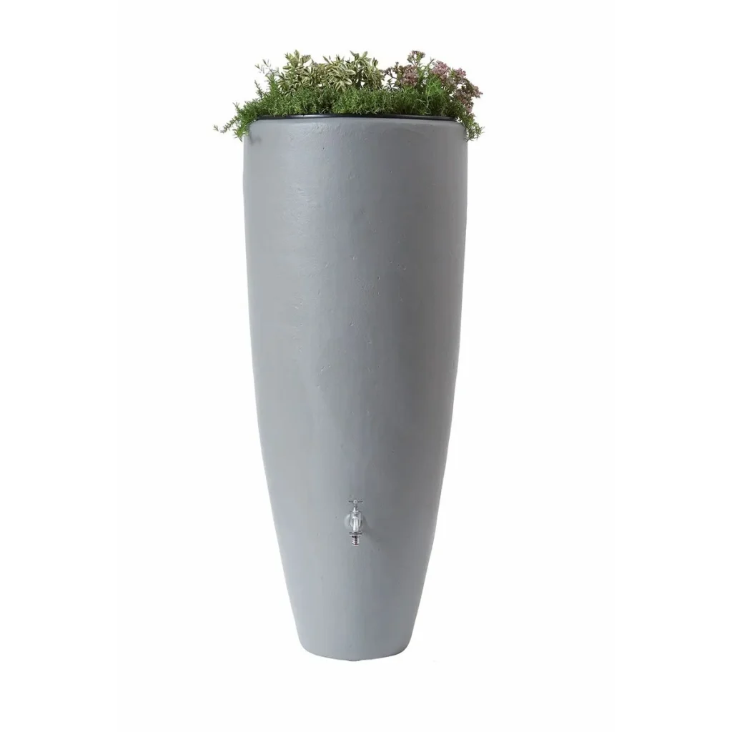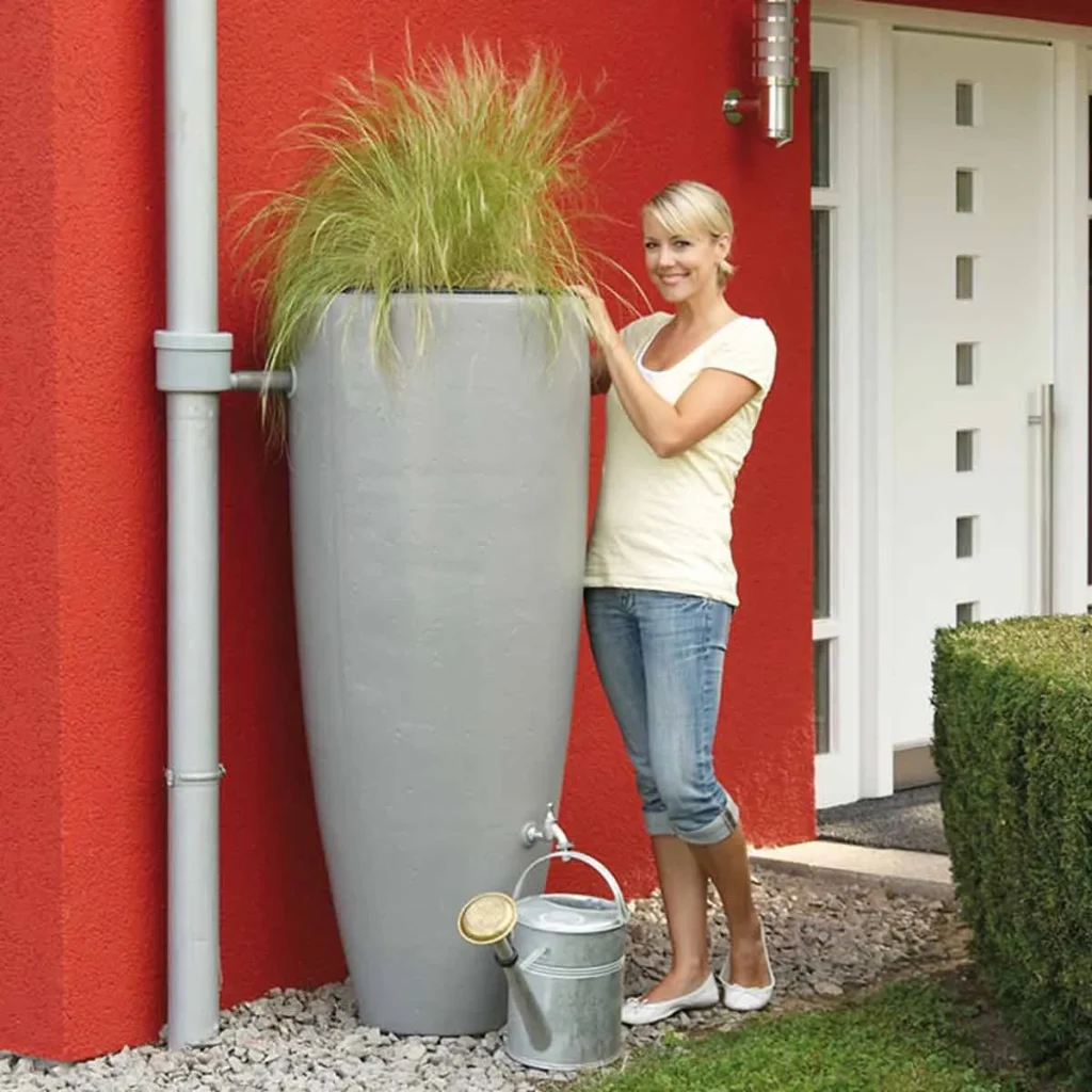 Der Regenspeicher vereint funktionalen Wasserspeicher und stilvolles Pflanzgefäß in einem. Er wird einfach über einen Regensammler an das Fallrohr angeschlossen und ermöglicht so eine effiziente Nutzung von Regenwasser.